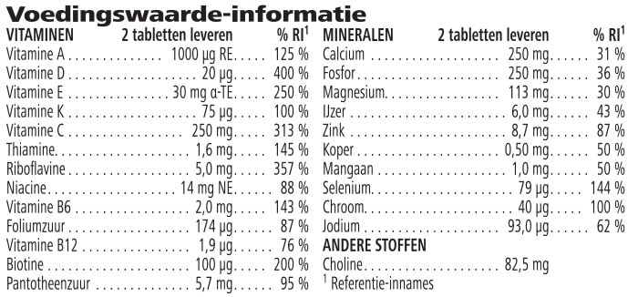 Mix met vitaminen en mineralen (dicalciumfosfaat, magnesiumfosfaat, L-ascorbinezuur, cholinebitartraat, DL-alfa-tocoferylacetaat, calciumcarbonaat, magnesiumoxide, ijzer(II)fumaraat, bèta-caroteen, nicotinamide, retinylpalmitaat, cholecalciferol, D-biotine, zinkoxide, calcium-D-pantothenaat, natriumseleniet, riboflavine, chroom(III)chloride, mangaansulfaat, pyridoxinehydrochloride, cyanocobalamine, thiaminemononitraat, fyllochinon, pteroylmonoglutaminezuur, koper(II)sulfaat, kaliumjodide), vulstof (microkristallijne cellulose), tablet omhulling [glansmiddel (hydroxypropylmethylcellulose), kleurstoffen (calciumcarbonaat, geel ijzeroxide), antiklontermiddel (vetzuren), vulstof (microkristallijne cellulose)], antiklontermiddelen (vernette natriumcarboxymethylcellulose, vetzuren, magnesiumzouten van vetzuren, siliciumdioxide), stabilisator (polyethyleenglycol).