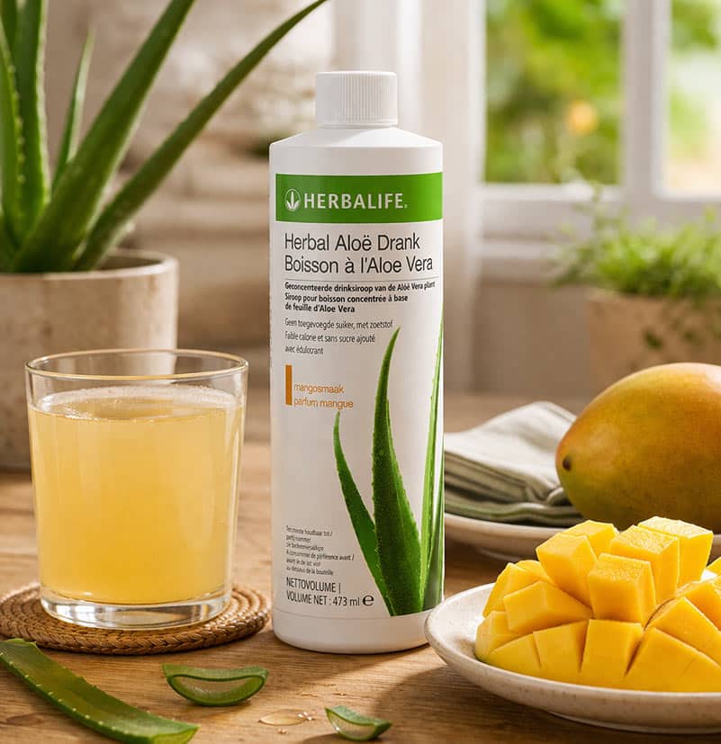 Herbal Aloëdrank (473 ml): 15-20 ml per portie. Het is een verfrissende drank die aloë verasap bevat waarmee je water een verfrissende, tropische smaak geeft. De Herbal Aloëdrank is gemaakt van het verzachtende aloë verablad, en is verkrijgbaar in de smaken: Mango en Original.
