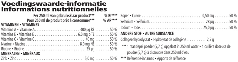 Verisol® P collageenhydrolysaat (varken), maltodextrine, natuurlijk aroma, zuurteregelaar (citroenzuur), zoetstof (steviolglycosiden uit Stevia), Vitamine C (L-ascorbinezuur), Vitamine E (DL-alfa-tocoferylacetaat), Vitamine A (bètacaroteen), zinkcitraat, Niacine (nicotinamide), koper(II)citraat, kaliumjodide, natriumseleniet, Biotin (D-biotine).