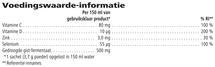 Per zakje (3,7 gram opgelost in 150 ml water) levert Immune Booster 100% van de aanbevolen dagelijkse hoeveelheid vitamine C en selenium, 200% van vitamine D en 30% van zink. Vitamine C, selenium en zink dragen bij aan de bescherming van cellen tegen oxidatieve stress. Vitamine D draagt bij aan de normale werking van het immuunsysteem.