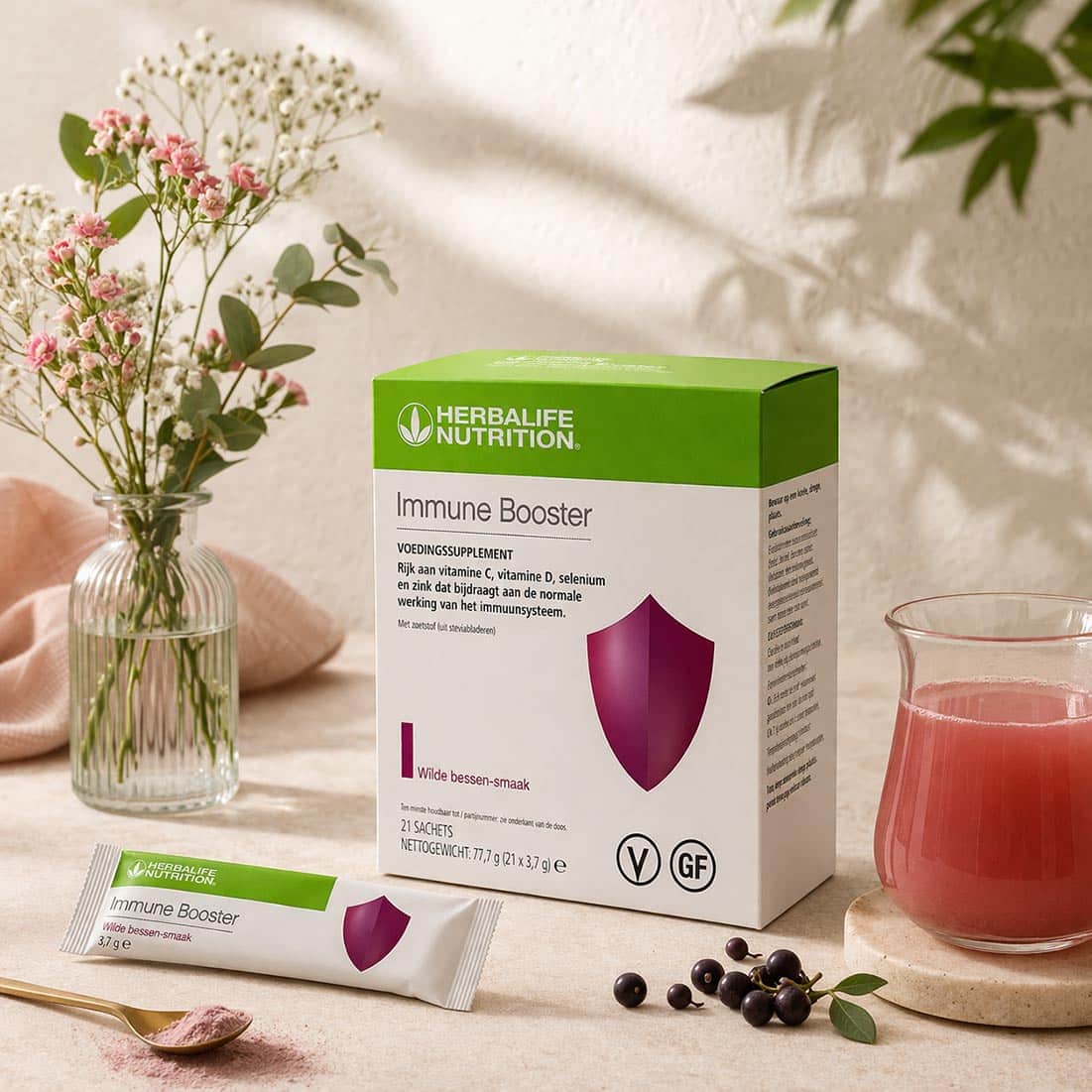 Je immuunsysteem werkt elke dag zonder dat je er iets van merkt. De Immune Booster is een dagelijks supplement in poedervorm met een bessensmaak, bedoeld als aanvulling op je voeding.