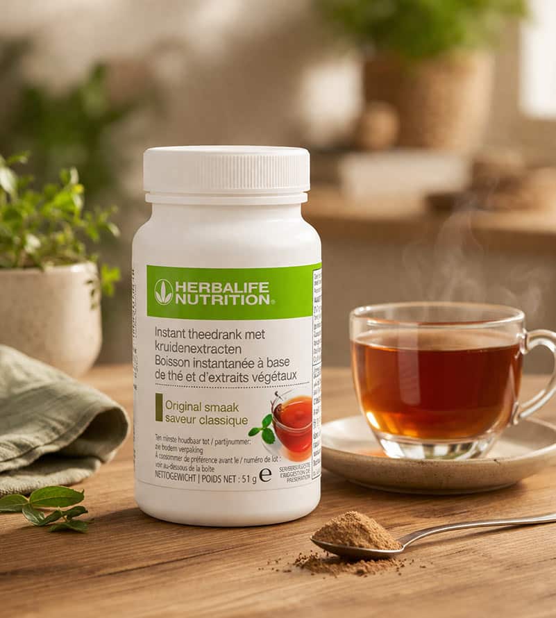 Het pakket bestaat uit drie producten die samen een complete ochtendstart vormen: de Formule 1 voedingsshake (romige vanille, 550 gram), de Instant Theedrank Original (100 gram) en de Herbal Aloëdrank Mango. Ze zijn ook los verkrijgbaar, maar als pakket dekken ze de drie dingen die je lichaam 's ochtends als eerste nodig heeft: vocht, een lichte energieboost en een volwaardige voedzame maaltijd.